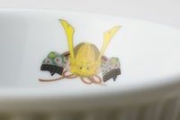 明るい黄色をベースに由緒ある戦国武将の兜模様をあしらったご飯茶碗です。少し小さめサイズで、お子様に人気です。同柄で、かぶと絵 しのぎ湯呑がございます。 ほんの少しうつわにこだわれば贅沢な気分になります。手持ちの良さがくつろぎを、真白な磁器肌が安らぎを。百碗十色、口福のうつわで極上のひと時をお過ごし下さい。