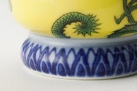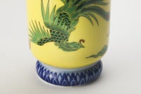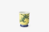 明治期に欧州へ輸出していた頃の意匠「竜鳳凰錦手黄地」のフリーカップです。他にはない特別な魅力がある作品です。 竜と鳳凰は四霊のうち最高の吉祥を意味し、陶磁器においても数々の名品を生み出してきました。本作は、古来より皇帝にのみ用いる事を許されてきた鮮やかな「黄彩」に「緑彩」を用いて大胆に竜と鳳凰を描いています。青色で染付けられた高台が黄彩、緑彩で彩られたカップの魅力をさらに引き立たせています。動物モチーフ竜 龍