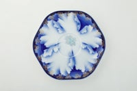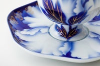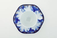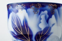 この意匠は、深川忠次が明治期より好んで描いています。欧州から導入したエアログラフ(吹き掛け手法)により呉須の濃淡で表現された牡丹の絵、深川独自の明るく澄み切ったブルーにより描かれた牡丹の花は、アールヌーボ華やかな19世紀末のヨーロッパの金彩装飾文様「金ミル」を施されて「深川様式美」を代表する意匠となっています。 日本の工芸磁器の魅力をお楽しみ下さい。