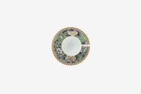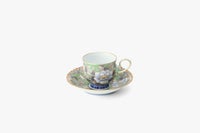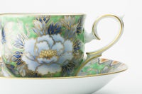 染錦で描かれた牡丹や鳥の外側を丹念に上絵の緑色で塗り込む「外濃」(そとだみ)と呼ばれる手法は明治期から大切に描かれ伝統技法が織り成す緑と青のバランスが見事に調和し、上品に仕上がった作品です。繊細な美しさと高級感を兼ね備えた深川製磁ならではの上品な輝きが、特別なひとときを演出します。お気に入りの珈琲やエスプレッソをお楽しみ下さい。