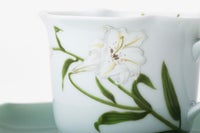 白百合の花言葉は「純潔、無垢」。何よりもこだわったのは、上品な「WHITE」です。上質な陶石を1350度の高温度で焼成する事により生まれる透けるような真白な磁器肌。幸せの大輪を咲かせたような優雅な白百合の花びらは、伝統的な技法によって特別に調合したいくつもの白い上絵具で描かれ、モダンなニュアンスをもつ柔らかな白のハーモニーが魅力です。愛らしいフリルのかたちにのせて優しい風に揺らぐ清楚な白百合の姿はまるでレリーフ。使う度に幸せに包まれるコレクションです。