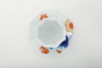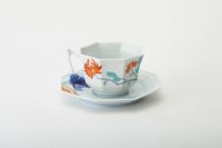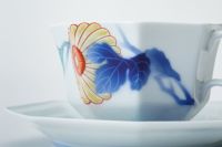 工芸文化の華ひらいた江戸時代に、有田で生まれた「柿右衛門様式」「色鍋島様式」は佐賀藩より幕府・朝廷に献上されました。また、長崎から海外にも輸出され、世界の陶磁器愛好家を虜にしました。 艶やかな文様は高度な「染付」「赤絵」技法により魅力的に表現されています。 『色絵菊花紋』はその伝統を継承する初代深川忠次が残した明治期の意匠図より現代に復刻したものです。染付の青と赤絵のコンビネーション「染錦」で描かれた文様は深川ならではのもので、ターコイズブルーの「うす青」「朱色」と黄色の「きび色」と全て自社調整する赤絵具の魅力が際立っている作品となっております。