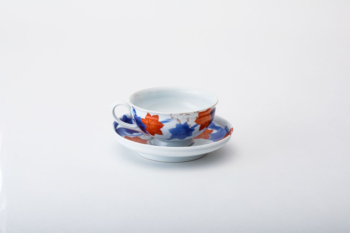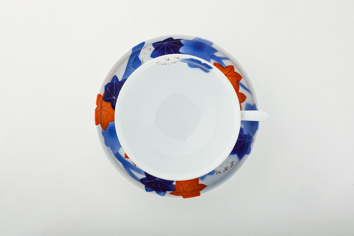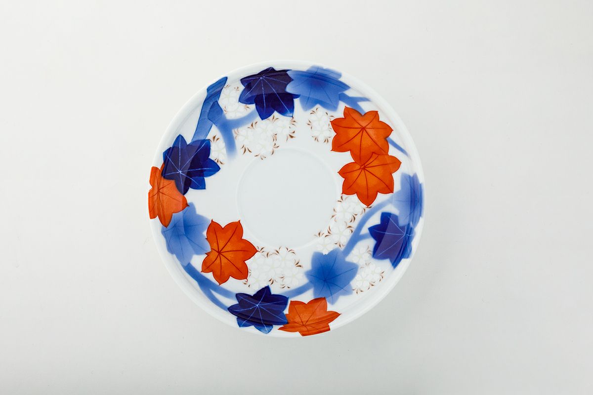 艶やかな「春秋文様」は、春の桜、秋の紅葉と「日本の四季」を表した吉祥文様で、江戸期より「粋」な様式として親しまれてきました。この意匠は、初代深川忠次が好んで描いたもので、エアログラフ(吹き掛け手法)を用いて楓の葉を染めて、釉薬を掛けて1,350度の窯で焼き上げ、さらに金彩と有田独自の盛絵具で桜文様を絵付けして800度強の錦窯で焼き上げた「染錦手法」のものです。 西洋文化を取り入れ、世界に開かれた明治期に、いち早く洋食器を制作・輸出した初代忠次、その心意気が感じられます。 明治27年創業の有田の工房で、当時の製陶技術を継承した職人が、当時と同じ製法で焼造したものです。