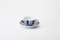 「赤・青・黄・白・緑」や「青・赤・黄・白・紫」など陰陽五行説の五行配当色は、日本に伝来して後、仏教の行事に用いられる垂れ幕や、神社の神殿を飾る「幡」、吹流しなどに用いられています。 「染錦割模様」は、この五色を有田焼伝統の「染錦手法」により陶磁器意匠として描いたものです。 上質の天草陶石を精製した粘土をロクロ成形し、染付の薄青、濃青を染めて透明釉と天目釉を掛け別けて1,350度の高温度で焼成し、更に赤絵工房で黄、緑、紫、赤を描き、錦窯で焼き上げたものです。