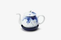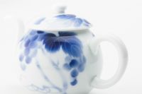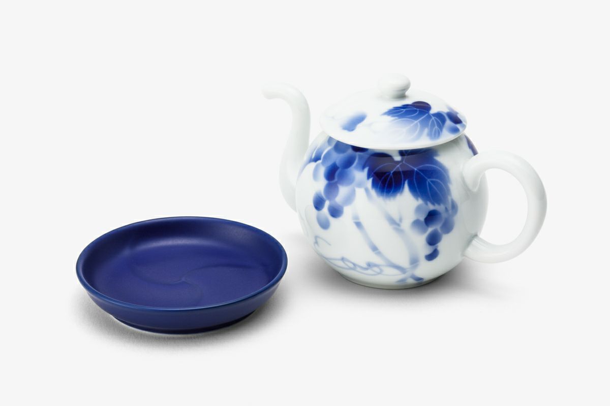 ぶどうの意匠は、古今東西を問わず吉祥紋様です。「用の美」 を追求した現代的な形姿に、100年前の下絵技法 「エアログラフ」によるブルーのグラデーションが真白な肌に染め込まれ、現代のブルー&ホワイトとして再現されています。白の間に、調子を取る様に伸びる 「つる」を手描きで入れているのも、一つ一つの表情の違いが器に温かで気韻ある印象を与える為です。熟練した職人の手技による現代のブルー&ホワイトには、明治期以来頑なに変わる事なく伝承してきた工芸品としての魅力が備わっています。