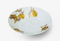 「幸福の訪れ」を意味する紅白梅と鳳凰の吉祥文様が凝縮された、慶びの席にふさわしい逸品です。 煮物やちらし寿司、季節の盛り合わせなど、特別な日の料理を美しく引き立てる深さとサイズ感を備えています。緩やかに波打つ縁どりが、器全体に柔らかさと品格を添えます。