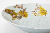 格式と美しさを兼ね備えた、華やかなおもてなしの器。縁起の良い紅白梅と金彩で彩られた扇面紋が大きく広がり、食卓に晴れやかな印象を添えます。絵付けの鮮やかさと白磁の上品な輝きが調和し、格調高い華やぎを演出します。
