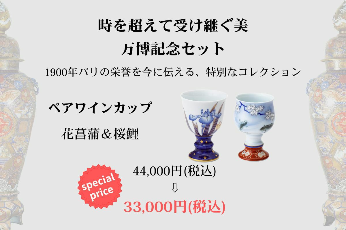 深川製磁は、1900年のパリ万国博覧会において金賞を受賞した大壺を有しており、今回の万博出展を記念した特別企画として、当時海外へ輸出されていた作品の復刻版を、特別セットでご提供いたします。