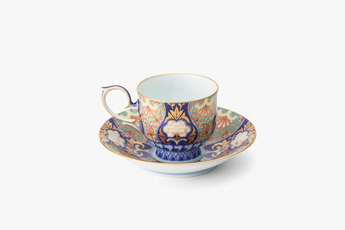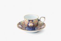 コーヒー碗皿は染付の青、錦の赤と金、そして緑で描かれたアラベスク文様が美しい「古伊万里唐草」の意匠です。西洋と東洋の交流で生まれた魅力的な作品となっています。