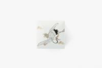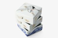 動物モチーフのなかでも優美な鶴を金と白金(しろがね)で描いた「白金波鶴紋」は、ジャポニズムの香りを含んだ意匠として明治期、欧州に向け盛んに輸出されてきました。本作では、美しき日本の迎春を祝い、角三段重に若冲を彷彿とさせる白鶴を白盛絵具で大胆に描き、「白金波鶴紋」を仕上げています。