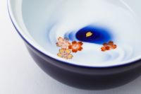 桜は、日本の象徴の花と言えます。本居宣長の和歌にも、「しき嶋のやまとごころを人とはば、朝日ににほう山ざくら花」と記し、桜のもつ日本人の精神に与える吉祥を的確に述べています。 この「花は桜」意匠は、染付で春霞(はるがすみ)を表し、その間(ま)を満開の桜が咲き乱れるかの様に朱赤と金で上絵つけされています。