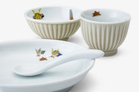 遊び心ある兜文様をモダンにあしらった男の子の子供用食器。元気な男の子になるようにと由緒ある戦国武将の兜の模様をあしらいました。 黄色、ピンク、緑、青といった子供が好きな楽しい色で描かれ想像力が広がります。形姿は温かみのある柔らかな手触りと強度も兼ね備えたもの。 この器で「陶磁器は欠けるもの」だからこそ「大事に使ってね」と道具の大切さも学んでほしいと願っております。 子供の誕生から100日目に行われる「お喰い初め」、将来この子が食べ物に困りませんようにとお子様の健やかな成長を願う贈り物としてもおすすめのお品です。 お子様が成長されても日常使いにも欠かせない器をセレクトした4点セットです。