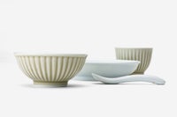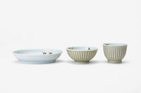 (谷型楕円和皿)縦15cm , 横16.5cm , 高4cm (しのぎ湯呑) 径 8.5cm , 高 6.5cm (しのぎ飯碗) 径 11cm , 高 5cm (HAKUJI13cmスプーン) 長さ 12.5cm , 幅 3cm