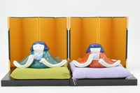 男雛 :高8.5㎝、径(幅)13㎝、径(長)18㎝ 女雛 :高8㎝、径(幅)12㎝、幅(長)17㎝ 屏風 :高:22cm