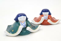 世代を超えて愛され続ける雛人形。一体一体表情や着物の意匠が異なるのは、熟練の職人が細部まで拘り、丁寧に描いているからです。男雛と女雛の着物には、配色を変え、明治期から大切に描かれている代表的な文様である「西海波」と「千鳥」を金彩で描いております。 その波と千鳥を組み合わせた「波千鳥」は、波間を世間に喩えて、「共に荒波を乗り越えていく」という意味があり、夫婦円満や家内安全などの大変縁起の良い柄として親しまれています。