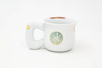 取手が大きくがっしりとしているのに驚くほど軽い「モーニングカップ」。 持ち手部分に小さな赤と水色の丸紋を浮かぶように配置し、本体にはドラマチックに四君子が映える構図が、使い手の心を躍らせます。