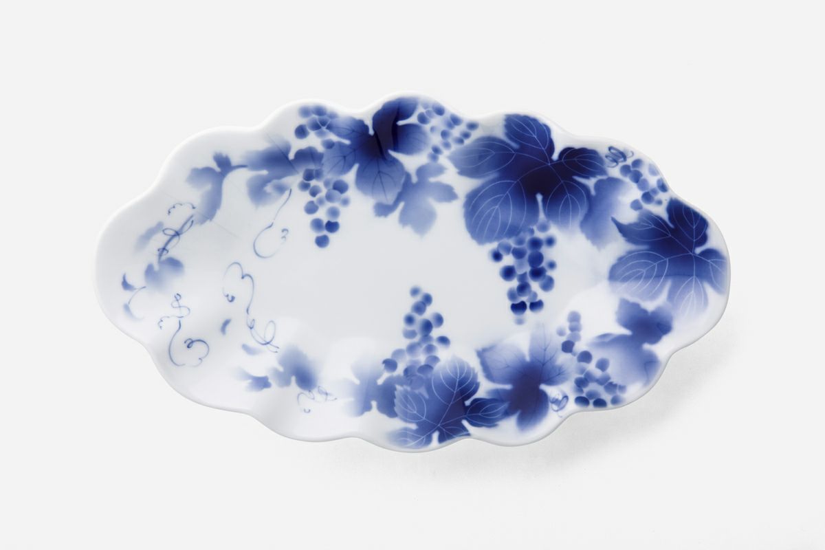 ぶどうの意匠は、古今東西を問わず吉祥紋様です。「用の美」 を追求した現代的な形姿に、100年前の下絵技法 「エアログラフ」によるブルーのグラデーションが真白な肌に染め込まれ、現代のブルー&ホワイトとして再現されています。白の間に、調子を取る様に伸びる 「つる」を手描きで入れているのも、一つ一つの表情の違いが器に温かで気韻ある印象を与える為です。熟練した職人の手技による現代のブルー&ホワイトには、明治期以来頑なに変わる事なく伝承してきた工芸品としての魅力が備わっています。