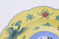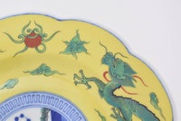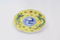 明治期に欧州へ輸出していた頃の意匠「竜鳳凰錦手黄地」の紅茶盛皿です。竜と鳳凰は四霊のうち最高の吉祥を意味し、陶磁器においても数々の名品を生み出してきました。本作は、古来より皇帝にのみ用いる事を許されてきた鮮やかな「黄彩」に「緑彩」を用いて大胆に竜(龍)と鳳凰を描いています。 縁起の良い動物モチーフの絵柄は海外へのお土産品や贈り物にも大変喜ばれます。