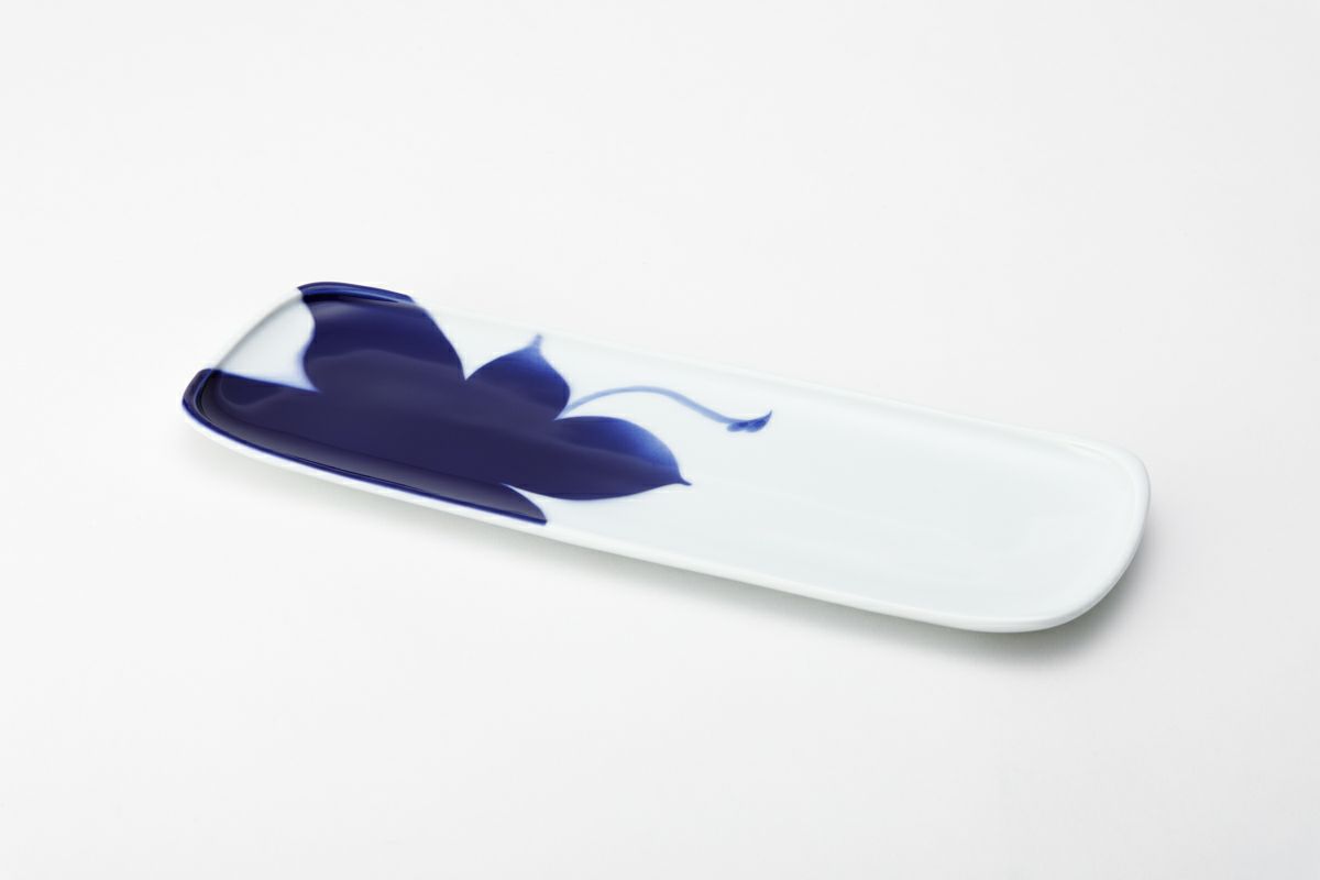 フカガワブルーで大胆にモミジを描いています。 窯の炎により変化する瑠璃の絶妙な色合いと、対比となる余白が美しい作品です。