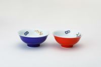 この組飯碗は、外側は青色と赤色の2色、中には宝づくしの絵柄が描かれています。宝物を集めた宝づくしの文様は代表的な吉祥文様のひとつで、福徳を招くとされています。