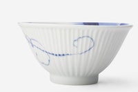 ぶどうの意匠は、古今東西を問わず吉祥紋様です。「用の美」 を追求した現代的な形姿に、100年前の下絵技法 「エアログラフ」によるブルーのグラデーションが真白な肌に染め込まれ、現代のブルー&ホワイトとして再現されています。白の間に、調子を取る様に伸びる 「つる」を手描きで入れているのも、一つ一つの表情の違いが器に温かで気韻ある印象を与える為です。熟練した職人の手技による現代のブルー&ホワイトには、明治期以来頑なに変わる事なく伝承してきた工芸品としての魅力が備わっています。