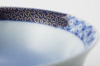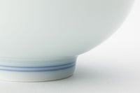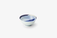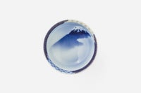 ご飯茶碗の内側には染付で富士山を描き、縁には金彩で金ミル文様を施し、若干沿ったかたちなので、少なめをお好みの方おすすめです。 そして、飯碗は必ず手に持って食すもの。高台にはわずかな角の丸みまで丁寧に削り、持ったときに手に優しくフィットするよう仕上げています。 富士の意匠を愛でながら毎日の食事が一層贅沢な時間に。世界遺産登録された富士山の優美な姿と、染付磁器による工藝の魅力をお楽しみ下さい。