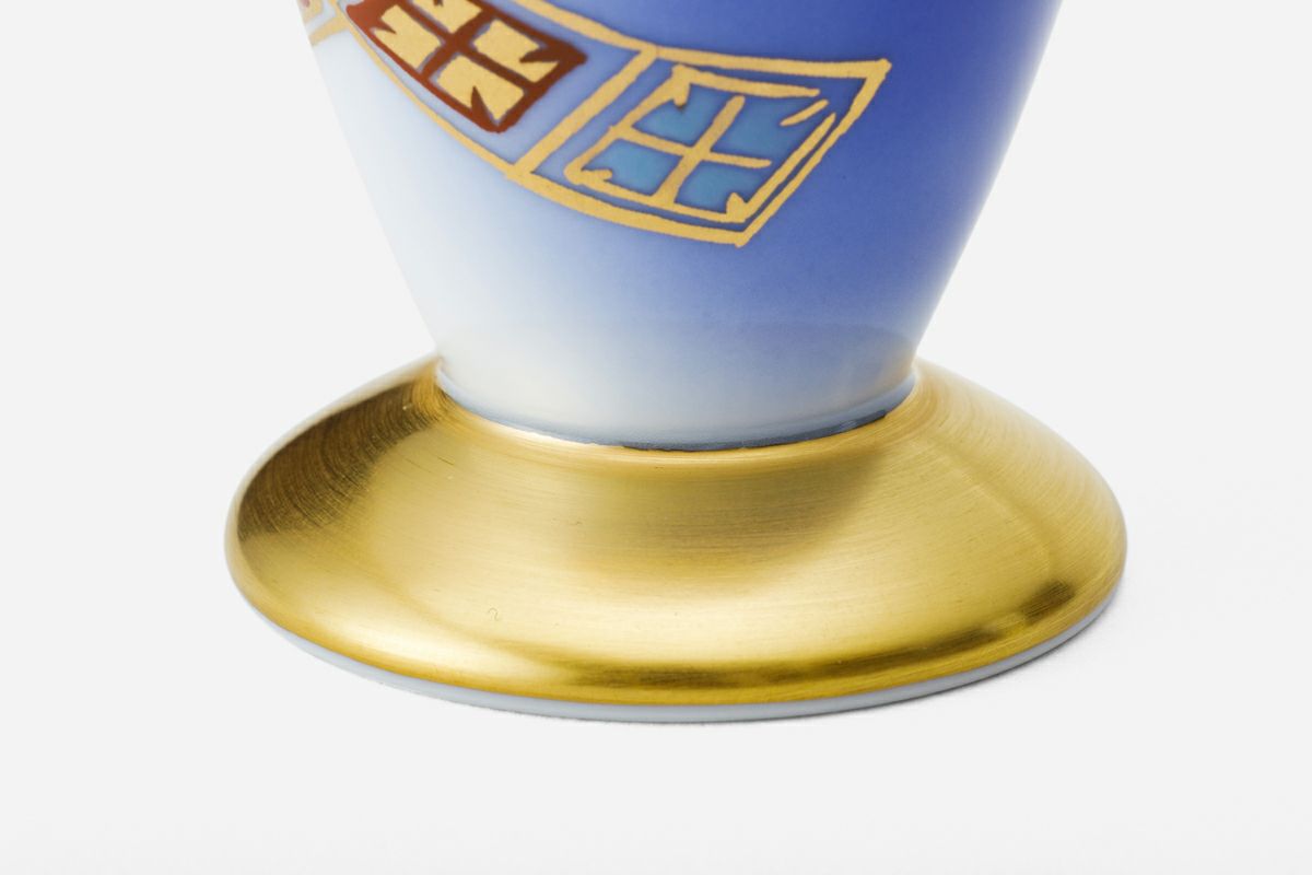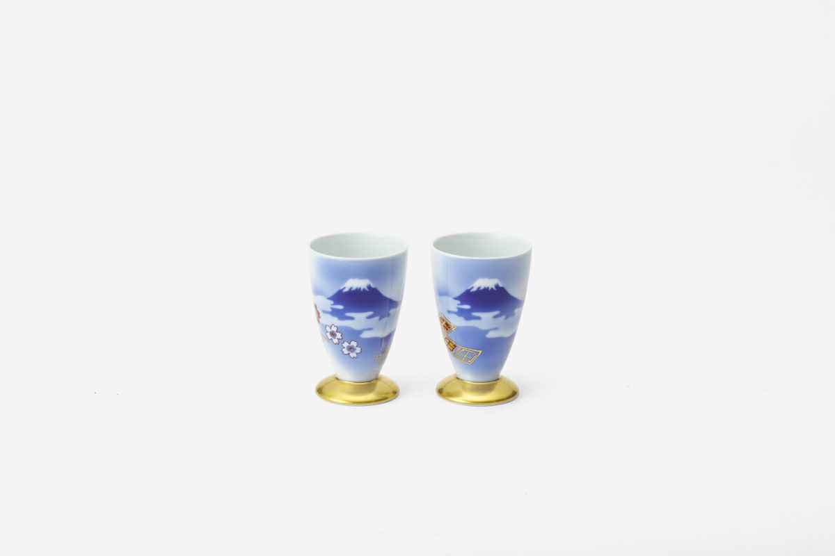 富士山のモチーフに桜と菱の絵柄を施した組酒杯。磁器ならではの滑らかな質感と優しい口当たりが特徴です。 お気に入りの絵付けが施された陶磁器で楽しむお酒の「色」、「香り」、「味」には他には無い特別な魅力があります。まさに自分の「嗜好」が、より強く確かめられるのが陶磁器の酒器と云えます。