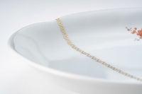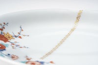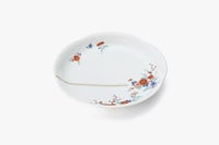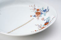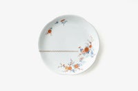 愛らしい花鳥の意匠は、自然の息吹を感じさせる優美な構図で描かれ、暮らしの中にやわらかな華やぎを添えます。伝統的な色鍋島の様式美を踏まえながらも、深川製磁ならではのやさしく上品な色使いが、見る者の心を和ませます。お正月など、ハレの日にも使い勝手のいいサイズのお皿です。
