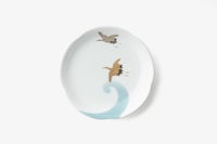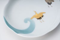 空色の様な薄い藍色の波を鶴が美しく羽ばたいてる様子をお楽しみいただけます。お正月など、ハレの日にも使い勝手のいいサイズのお皿です。