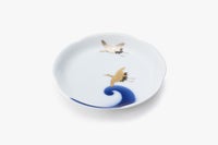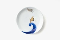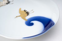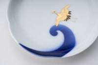 瑠璃色で描かれた波を鶴が美しく羽ばたいてる様子をお楽しみいただけます。お正月など、ハレの日にも使い勝手のいいサイズのお皿です。