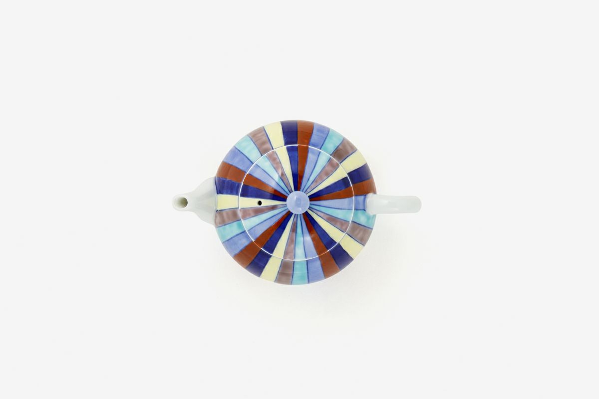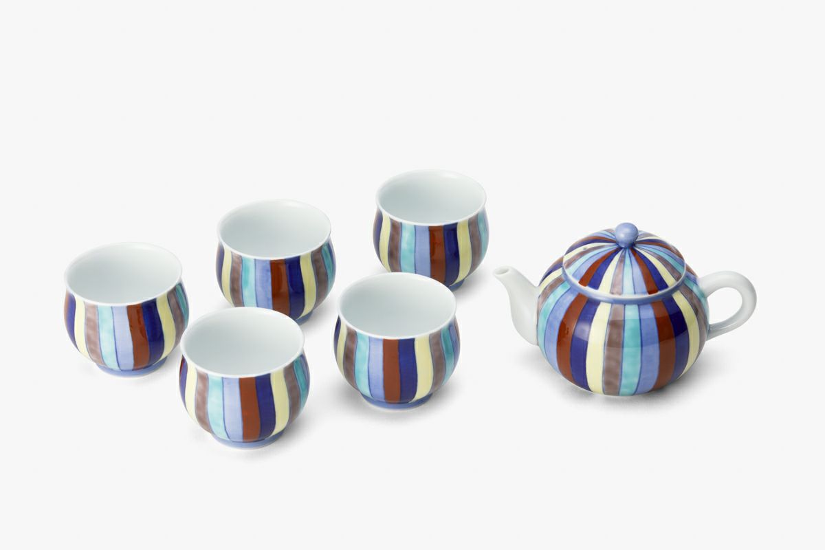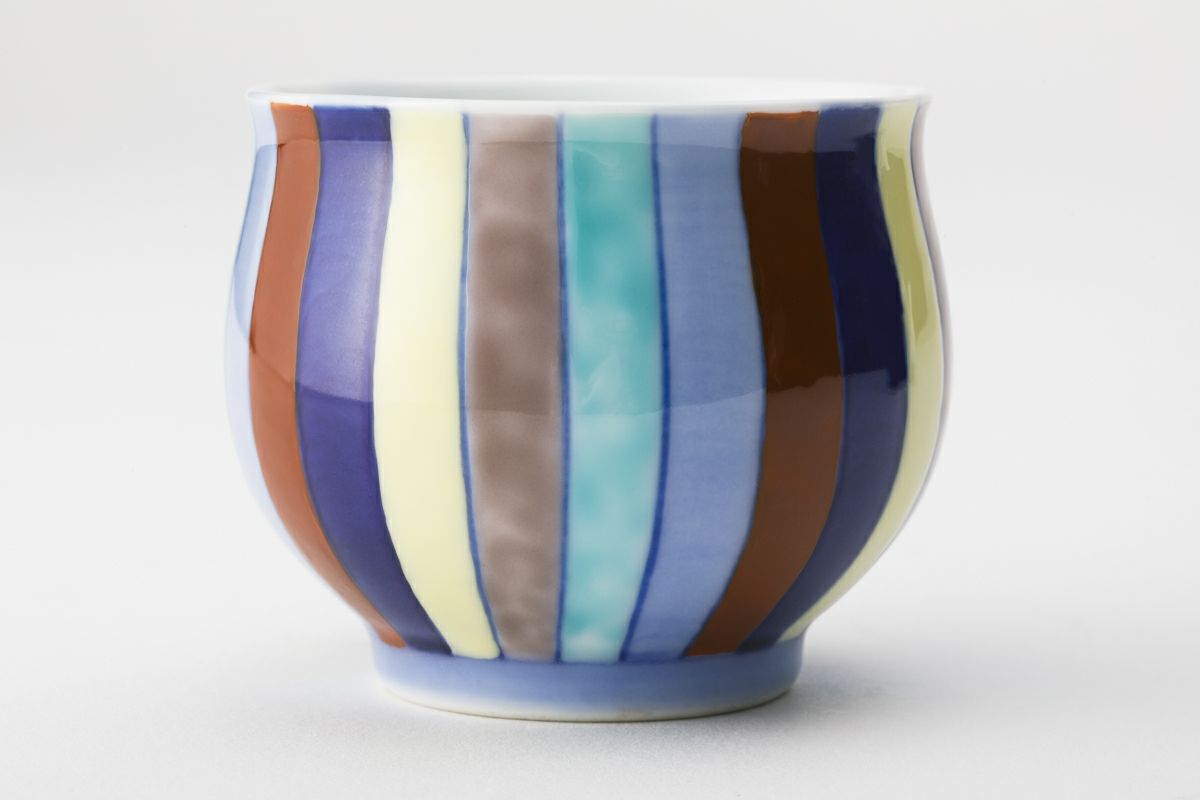 「赤・青・黄・白・緑」や「青・赤・黄・白・紫」など陰陽五行説の五行配当色は、日本に伝来して後、仏教の行事に用いられる垂れ幕や、神社の神殿を飾る「幡」、吹流しなどに用いられています。 「染錦割模様」は、この五色を有田焼伝統の「染錦手法」により陶磁器意匠として描いたものです。 上質の天草陶石を精製した粘土をロクロ成形し、染付の薄青、濃青を染めて透明釉と天目釉を掛け別けて1,350度の高温度で焼成し、更に赤絵工房で黄、緑、紫、赤を描き、錦窯で焼き上げたものです。