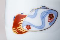 お茶の器は、口当たりと手に馴染む程よい形が重要です。二つの貝を染錦技法で描いた湯呑です。この「貝合せ」は平安時代から伝わる日本の遊びをモチーフにしています。数ある貝殻の中から対になる貝殻を当てる遊びですが、対になっている貝殻でなければぴったりと合わない為、貝合せは古来より円満夫婦の象徴にもなっていました。
