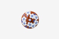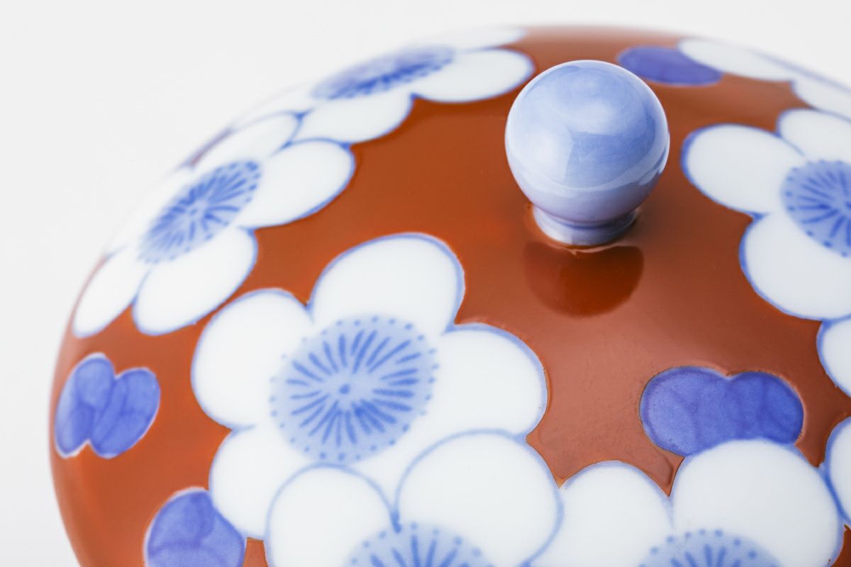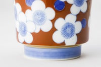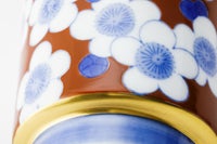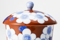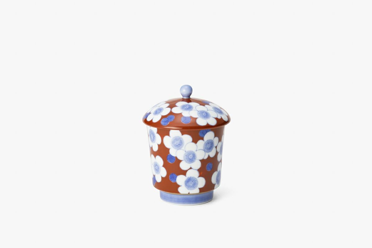朱赤色に、染付の青で梅小紋を描いた工芸的な蓋付きの湯呑です。染付の青に合う様に、自家調合した朱赤の色目がうつわのバランスを決めます。同柄で、梅小紋外赤 古伊万里型飯碗がございます。