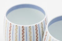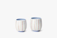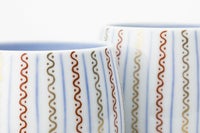 ゆらぎのある線が織りなす「よろけ縞」は、繊細な筆致と美意識が光る意匠です。柔らかく揺れる縞模様が、使う人の心にそっと寄り添います。ご夫婦やご家族でのペア使いにぴったり。磁器ならではの薄手でなめらかな口当たりと、手にしっくり馴染むフォルムは魅力です。