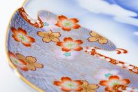 深川製磁は富士山をモチーフに多くの意匠を製作してまいりました。そこには独自の美意識があり、富士山を吉祥の象徴として捉え、そこに伝統的文様を配しています。富士山の変わらぬ美しさを金彩と赤絵の「波に桜紋」が引き立てています。
