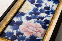 1900年パリ万国博覧会で名誉金牌を受賞後、初代 深川忠次は英国バーミンガムの貿易商「ワット商会」と代理店契約を結び広く欧州へ知られる事となります。これが「深川ポースレン」の始まりです。本意匠は、当時の製陶思想そのままに、現代の職人が丹念にリメイク、完成させたものです。中国では花の王とされる牡丹は、日本にも伝わり吉祥文様として好まれています。西洋では牡丹図はpeonyと呼ばれ、東洋の魅力的な花として人気を博しています。花の輪郭と葉を染付手法で描き、さらに、花びらには黄色とピンクの赤絵付けを施して牡丹の美しさを見事に表現しています。