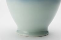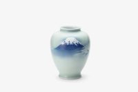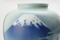 明治期以降富士山をモチーフに多くの意匠を制作してきた深川製磁が、その姿を染付の濃淡による光と影でやわらかく描写した作品です。 エアログラフ(吹き付け)によるグラデーションは、官窯染付の良さを余すところなく表し、深川独自の「気韻」を醸しだしています。