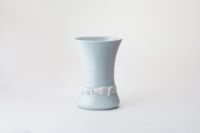 楕円形の魅力的な形姿の花生に、稲穂の陽刻をぐるりと施し、その部分だけ釉薬をかけずに1,350度の高温度の窯で焼き上げたものです。素地そのままに焼きあがった麦陽刻部分と、釉薬の掛かった透白磁にコントラストが魅力的な作品です。上質で工芸性の高い陶磁器でありながら、生けるお花を選ばない、シンプルなデザインとなっております。