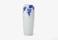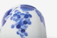 ぶどうの意匠は、古今東西を問わず吉祥紋様です。 用の美を追求した現代的な形姿に、百年前の下絵技法「エアログラフ」によるブルーのグラデーションが真白な磁器肌に染め込まれ、現代のブルー&ホワイトとして再現されています。白磁の間に、調子を取る様に伸びる「つる」を手描きで入れているのも、一つ一つの表情の違いが器に温かで気韻ある印象を与える為です。熟練した職人の手わざによる現代のブルー&ホワイトには、明治期以来頑なに変わる事なく伝承してきた工芸品としての魅力が備わっています。