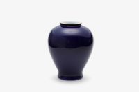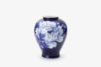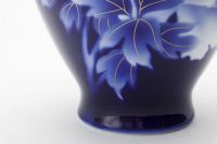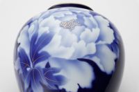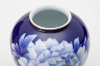 瑠璃地に淡い牡丹を描いた花瓶です。他にはない凛とした美しさがあります。裏面は瑠璃一色の為、シチュエーションによって使い分けてお使い頂けます。花瓶の前面に描いた淡い大輪の牡丹と、瑠璃地とのコントラストが美しいです。葉の葉脈、口縁にアクセントとして金彩をいれています。