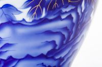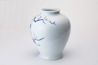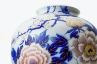 初代深川忠次が好んで制作していた「梅牡丹」意匠の花瓶、本作品は、現代の職人たちの手により制作されたものです。 古来より富貴の象徴とされる吉祥文「梅」と「牡丹」を有田400年の伝統技法「染錦手法」で表現しています。 天草陶石を自家調合した粘土を使用して成形し、初代深川忠次が当時欧州より持ち帰った染付の吹きつけ技法エアログラフにより、染めの強弱=グラデーションで牡丹の気高さと美しさを表現し、釉薬を掛けて1350℃で高温焼成します。 さらに金彩と赤絵を描き、錦窯で焼き上げております。