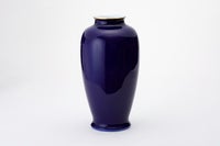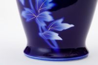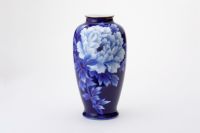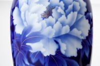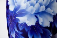 初代深川忠次は、1900年パリ万博出展後に欧州各地を巡り、西欧の新たな技法を吸収し帰国します。 圧搾空気を使用したエアログラフは、染付けの吹き掛け手法として自ら学び、機械を導入します。 本作品は、当時より好んで描いた牡丹絵を、深川独自の吹き掛け手法で染付けたものです。 釉薬を掛けて深川独自の1,350度の高温度還元焼成により深く魅力的な瑠璃色の牡丹が浮かびあがります。 さらに金彩を施して800度強の錦窯で焼き上げます。