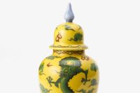 明治期に欧州へ輸出していた頃の意匠「竜鳳凰錦手黄地」の飾り壺。 竜と鳳凰は四霊のうち最高の吉祥を意味し、陶磁器においても数々の名品を生み出してきました。本作は、古来より皇帝にのみ用いる事を許されてきた鮮やかな「黄彩」に「緑彩」を用いて大胆に竜と鳳凰を大胆に描いています。