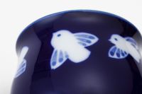 この意匠は、初代深川忠次の時代から造り続けているものです。雀の部分を墨で描き、全体を呉須で染めて窯に入れて焼き飛ばし、雀の部分を「墨ハジキ」技法で白抜きしています。釉薬を掛けて1350度の高温度焼成により深川独自の明るく品格のある染付磁器に焼き上がり、愛好家からは「深川ブルー」と呼ばれています。
