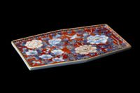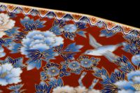 染錦で描かれた牡丹や鳥の外側を丹念に上絵の朱赤で塗り込む「外濃」(そとだみ)と呼ばれる手法です。明治期から大切に描かれた美しい牡丹の絵柄を丁寧に描き、伝統技法が織り成す朱赤と青のバランスが見事に調和し上品に仕上がった作品です。