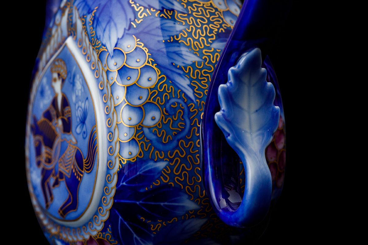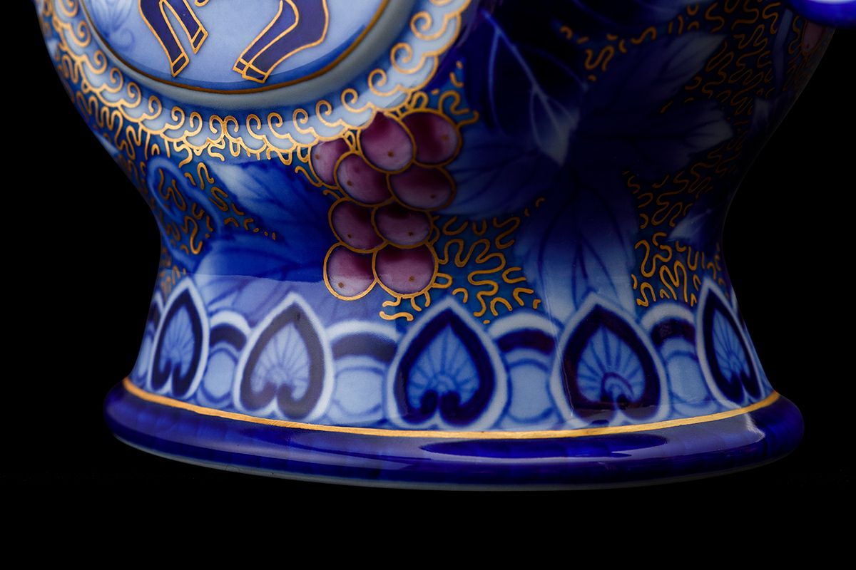 明治27年 創業当時より制作している作品で、中国明代にイスラムの王様のために創られた飾水差がルーツと思われます。 中央の窓絵にはイスラムの騎馬に乗った勇者が描かれ、周りには深川独自の染錦文様「ブドー金ミル」を配しています。複雑な形状に熟練の職人がブドー唐草を染付けし、釉薬をかけて1350度の窯でじっくり焼き上げると魅力的なブルーの水差しが焼き上がります。 さらに、赤絵の工房で、金彩とブドーの紫色を絵付して800度強の錦窯で焼き上げます。 粘土精製から成形、染付、釉薬、焼成、赤絵まで、それぞれの職人の熟練の技と心が生み出す工芸磁器の魅力をお楽しみください。