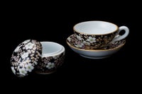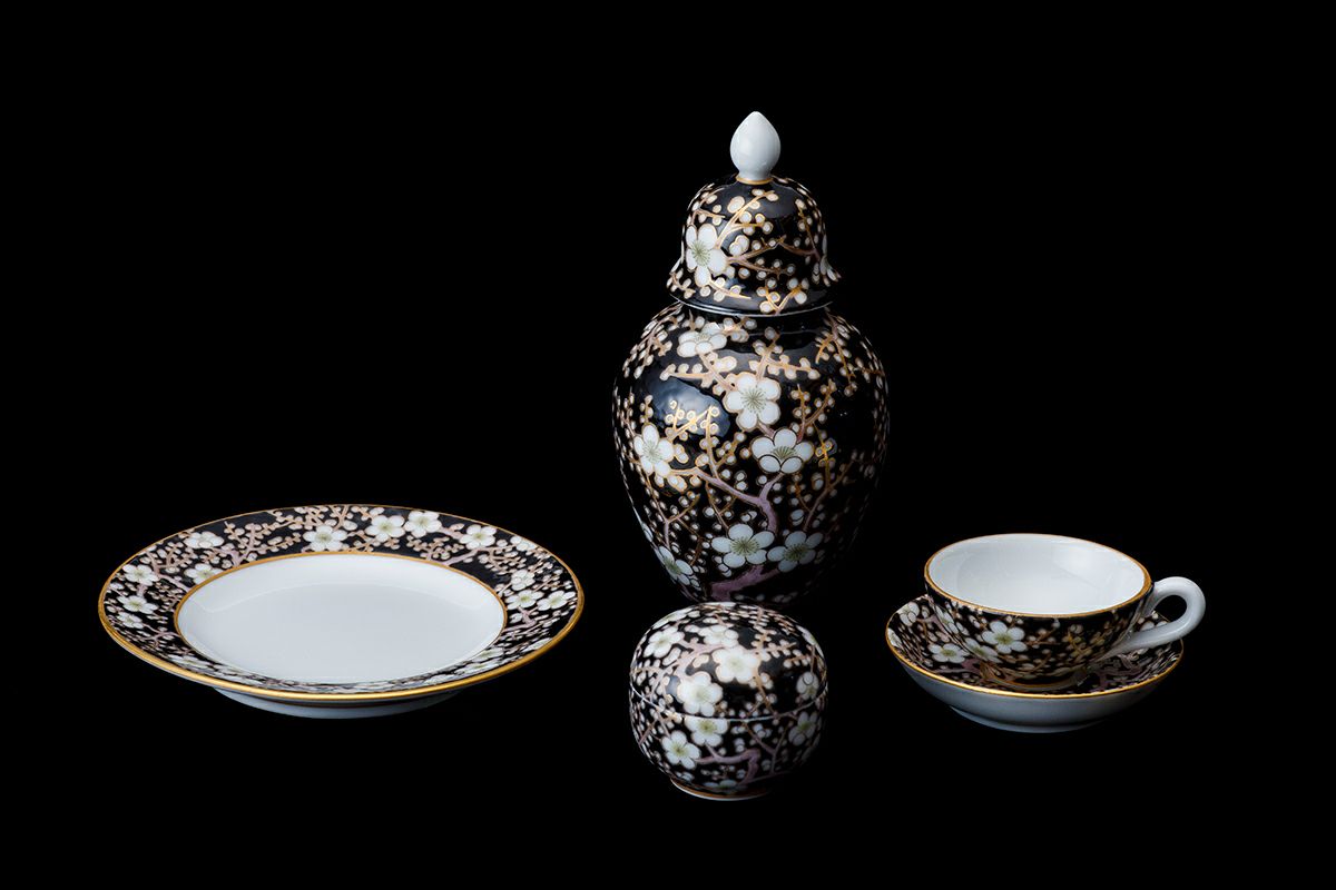鍋島家の雛壇を飾った雛道具として、明治期の深川製ミニチュア洋食器が佐賀の徴古館に所蔵されております。 初代 深川忠次は欧州直貿易を始めた際に、西洋人の好み、趣味を研究してドールハウスのお飾としてミニチュア洋食器を製作、輸出しております。 金彩で描いた梅模様を錦窯で焼きつけ、さらに金線を消さないように筆で丁寧に黒絵具を乗せ錦窯で焼き上げたものです。 職人の集中力と技が試されます。