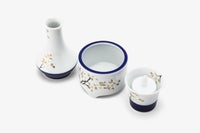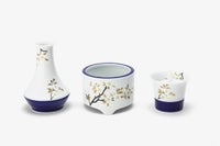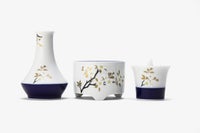 白の盛絵具と金彩で描かれた山桜は、大和心を象徴する意匠です。 花言葉は「純潔」「高貴」。 花生、線香立、ロウソク立の3具足がセットになった瑠璃さくらのセットです。