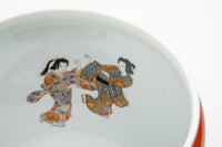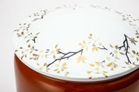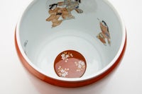 古来より、朱色は高貴な色として「邪気を祓う」と云われています。 全体及び水抜き盤を深川独自の艶やかな朱色で彩色し、蓋には日本人の心の花さくらを、中には花見踊りを配しております。