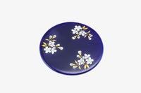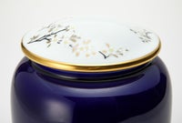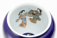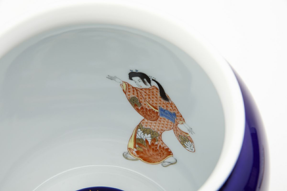 瑠璃の色はラピスラズリという幸運の宝石の色です。 本体及び水抜き盤を深川独自のフカガワブルー『瑠璃』で彩色し、蓋には日本人の心の花「さくら」を、内絵には花見踊りの姿を描いております。
